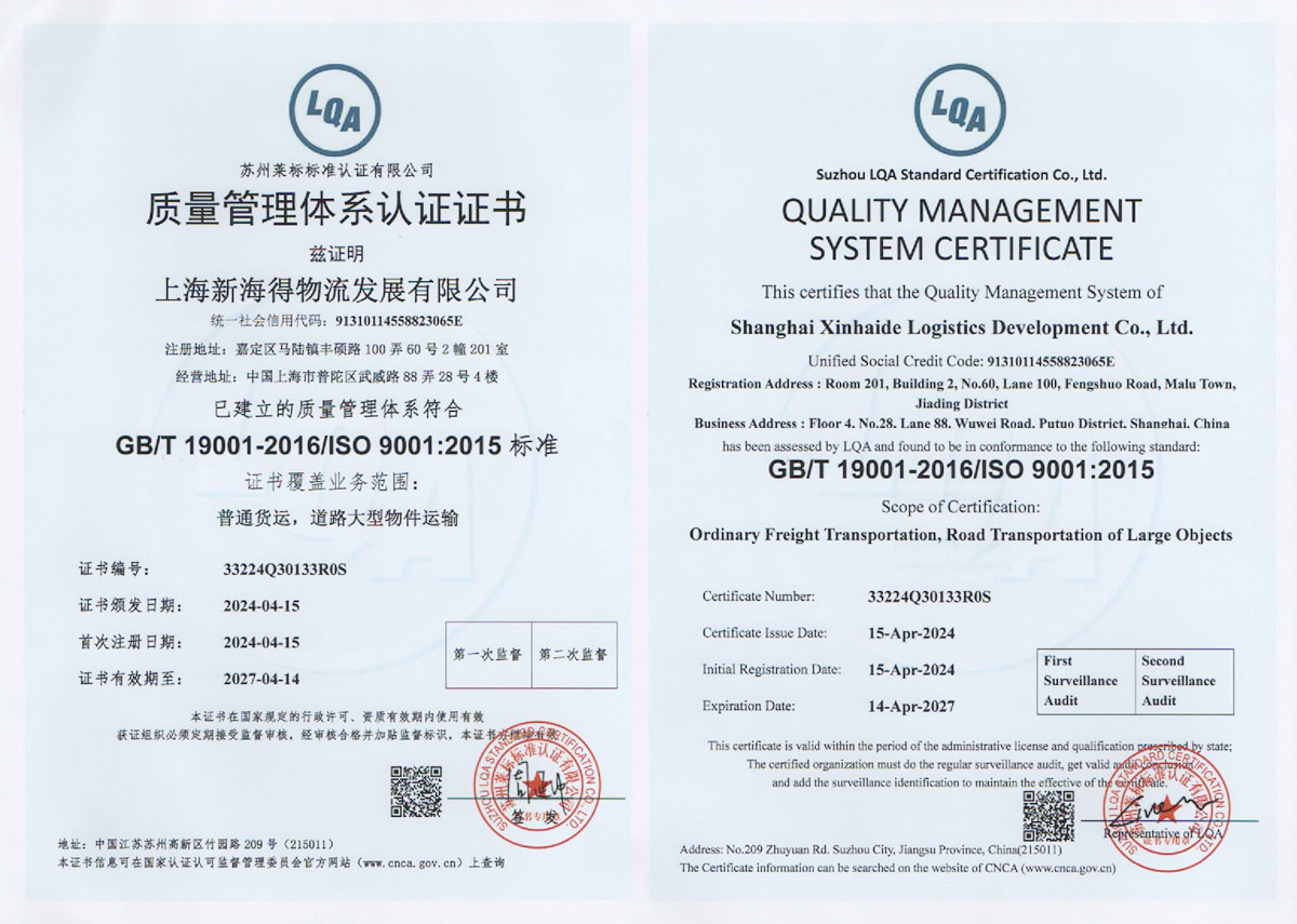 新海得物流嚴格按現(xiàn)代物流操作流程進行標準化運作。已通過國際質量管理體系ISO9001:2015體系認證。運用健全的客戶服務管理系統(tǒng)、車輛管理系統(tǒng),財務管理系統(tǒng)。在查詢、監(jiān)控、追蹤、結算等方面與客戶做到無縫對接,打造了專業(yè)高效的客戶服務體系。